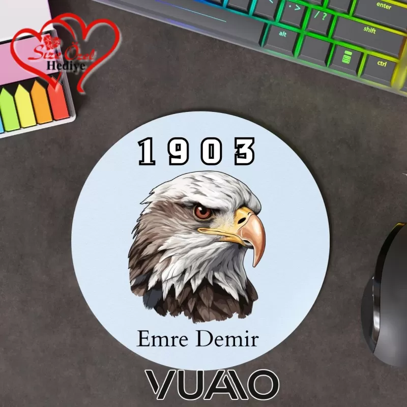 - Kişisel dokunuşunuzu yansıtan özel isim baskısı ile masaüstünüzü kişiselleştirin.; - Kartal temalı tasarımıyla ofis veya çalışma alanınıza şık bir görünüm kazandırın.; - 19.5 cm çapındaki geniş yüzeyi sayesinde rahat kullanım sunar ve kaymaz taban özelliğiyle sabit kalır.; - Baskılı yapısı ile hem estetik hem de işlevsel bir aksesuar olarak dikkat çeker.; - Bilek desteği bulunmadığından ergonomik bir kullanım sağlar; uzun süreli çalışmalarınızda konforunuzdan ödün vermezsiniz.; - RGB aydınlatma özelliği olmayan bu mouse pad, enerji tasarrufu sağlayarak maliyetleri düşürürken aynı zamanda görsel zenginlik katmayı sürdürür.; - Ürünün menşei Türkiye'den gelmektedir; yerel üretim avantajıyla desteklenerek kalite standartlarına uygun üretilmiştir.; - Dikişli kenar detayının bulunmaması, modern ve minimalist tasarım anlayışına uygun bir tercih oluşturur.